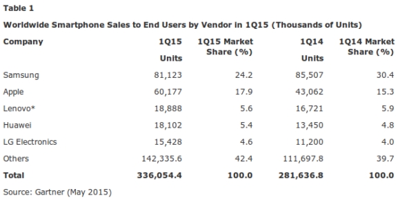 Samsung vendeu 81,1 milhões de smartphones nos primeiros três meses de 2015, comparado aos 60 milhões de iPhones, o que fez a sul-coreana conquistar 24,2% do total de vendas, enquanto a Maçã ficou com 17,9%. Esse aumento na venda de iPhones teve grande impacto especialmente na China, onde a gigante de Cupertino superou a Xiaomi pela primeira vez nos últimos anos. Temos que lembrar que Apple sempre lança um novo dispositivo no final do ano, sendo assim, é normal que no começo do ano seguinte haja uma grande procura pela novidade. Com isso, o crescimento deverá ser menor no segundo trimestre de 2015. Estes dados também foram confirmados pela pesquisa realizada pela CDB, anteriormente.